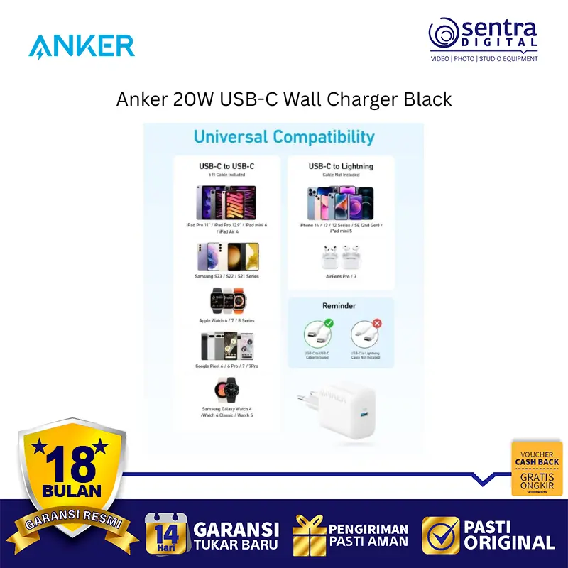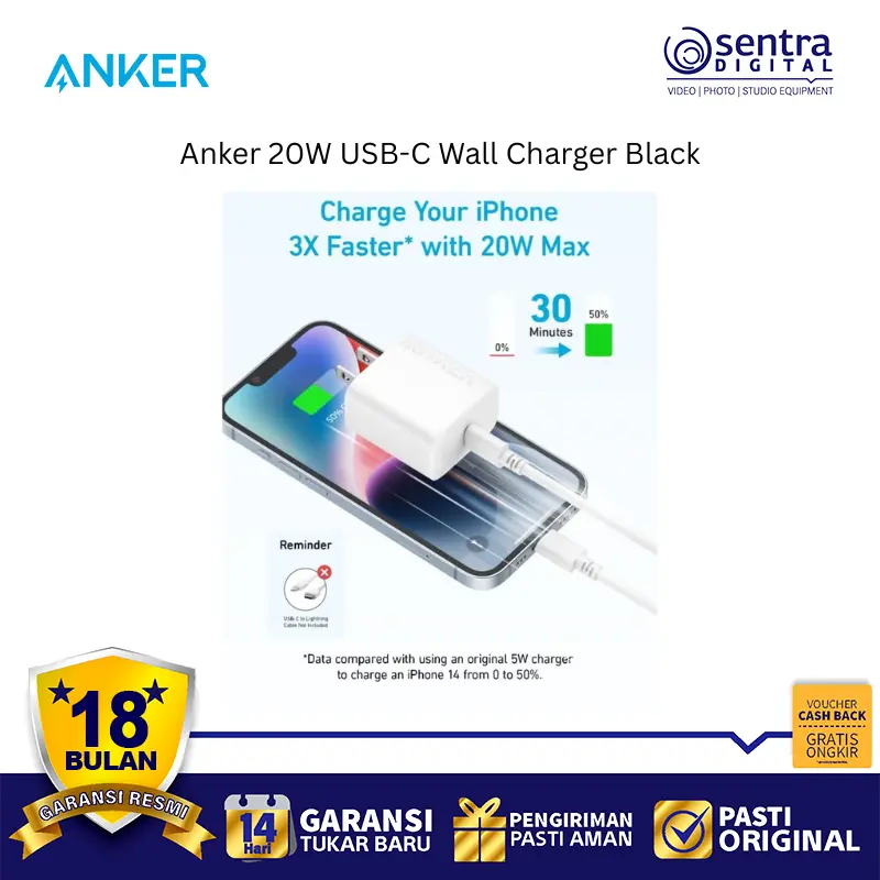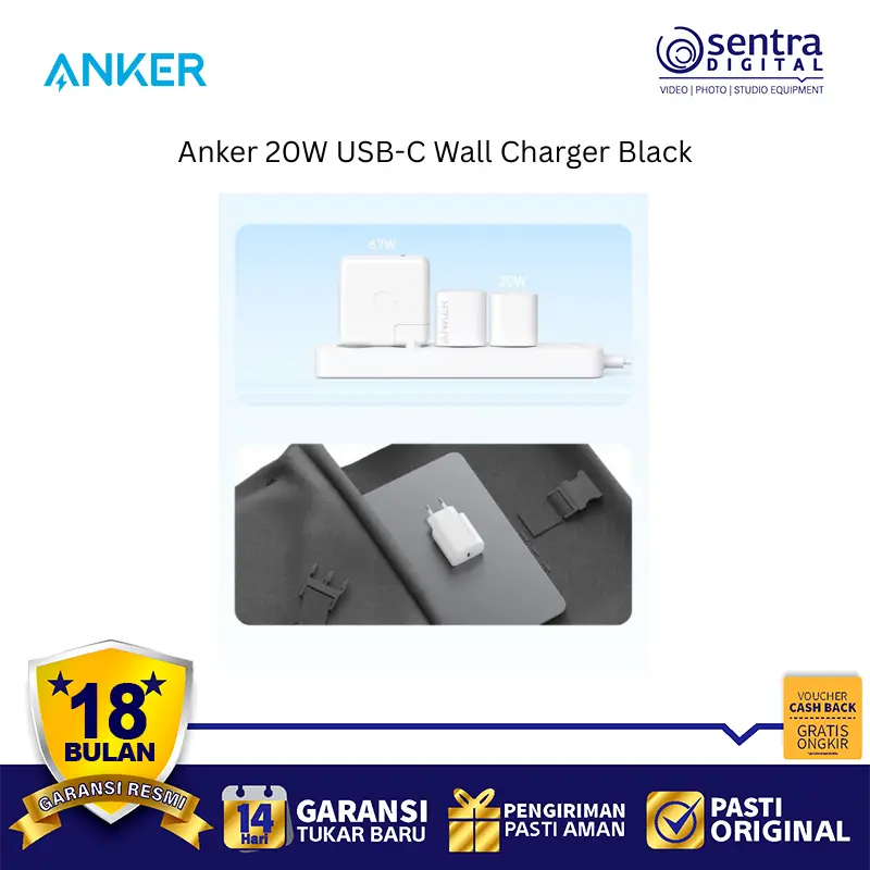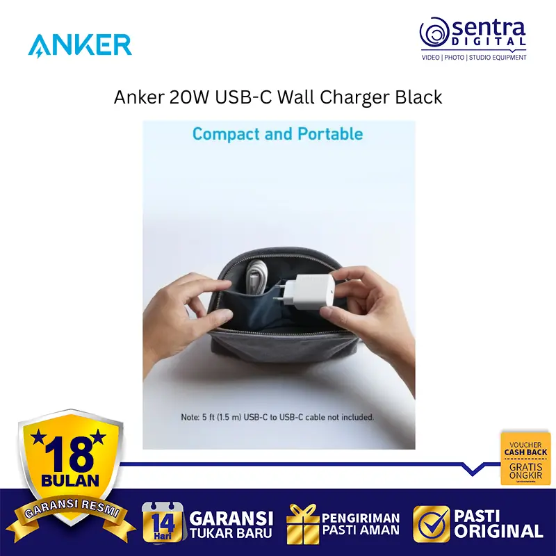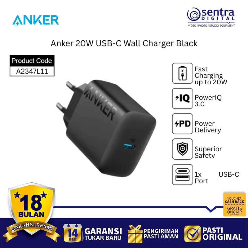 Anker 20W USB-C Wall Charger Black (Model A2347L11) adalah adaptor pengisi daya dinding yang sangat ringkas dan efisien, dirancang untuk memberikan pengisian daya cepat berdaya 20W melalui satu port USB-C. Charger ini memungkinkan Anda mengisi daya perangkat, terutama iPhone, hingga 3 kali lebih cepat dibandingkan charger standar. Dengan desain yang kecil, alat ini mudah dibawa bepergian, dan dilengkapi sistem keamanan MultiProtect dari Anker untuk menjamin pengisian daya yang aman dari risiko tegangan dan arus berlebih pada berbagai perangkat seperti iPhone, iPad, dan ponsel Samsung.