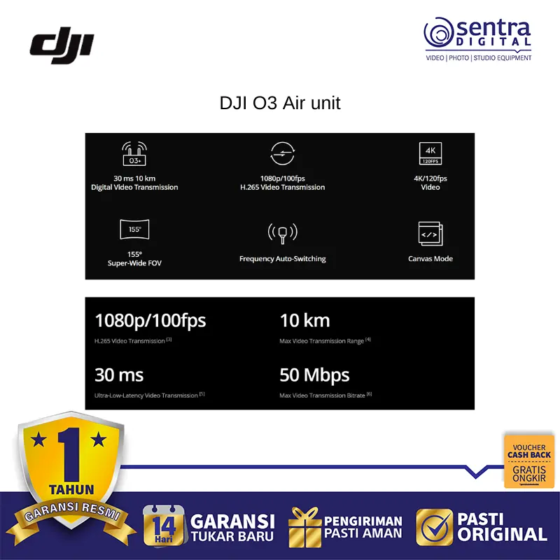 Selain kemampuan transmisi, O3 Air Unit juga berfungsi sebagai modul kamera dengan sensor 1/1.7 inci, memungkinkan perekaman video berkualitas tinggi hingga resolusi 4K pada 60fps dengan sudut pandas super lebar 155 derajat, dan dilengkapi penyimpanan internal 20GB. Ukurannya yang kecil dan ringan menjadikannya sangat kompatibel dengan berbagai jenis drone dan dapat dipasangkan dengan DJI Goggles 2 atau DJI FPV Goggles V2, serta DJI FPV Remote Controller 2.