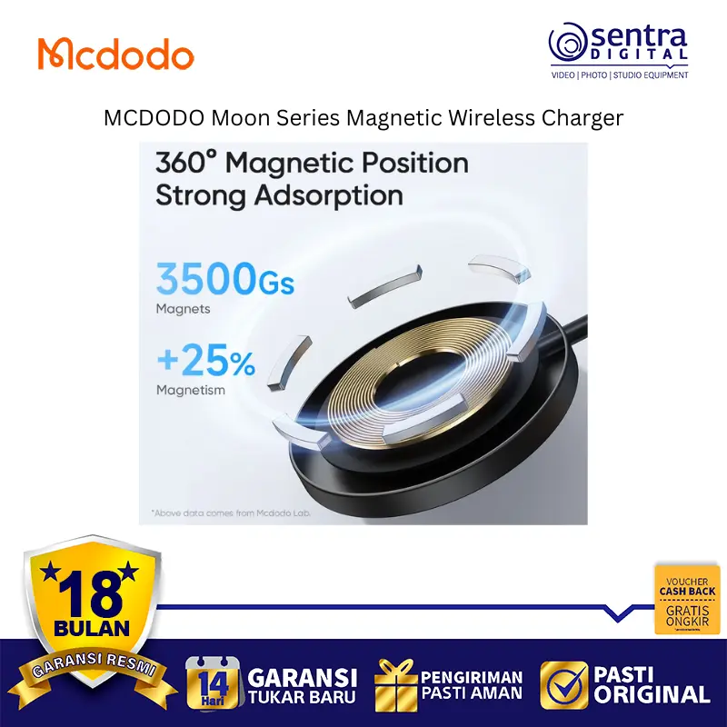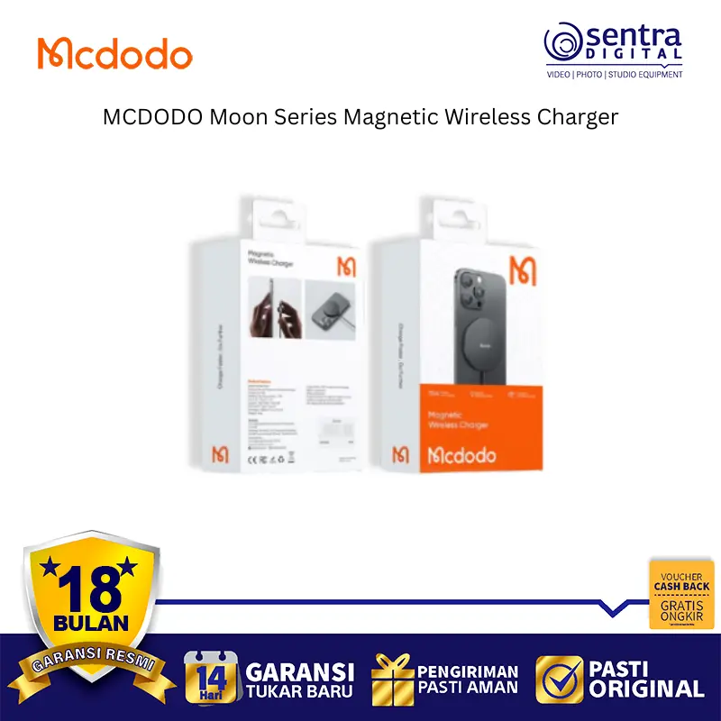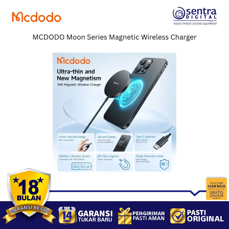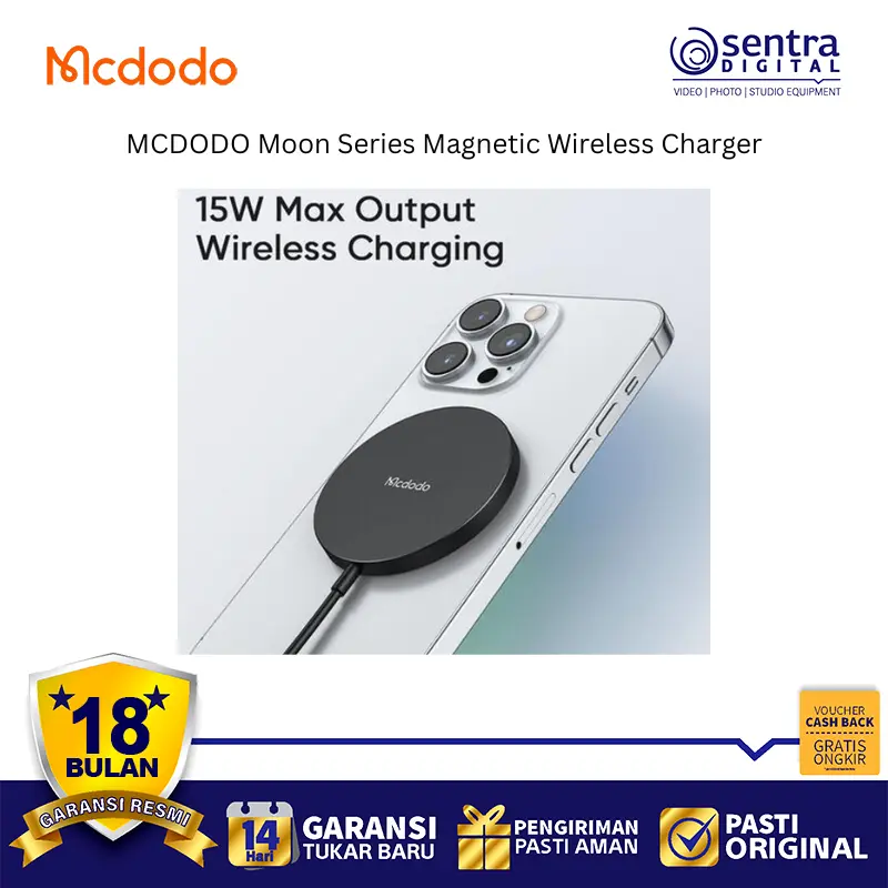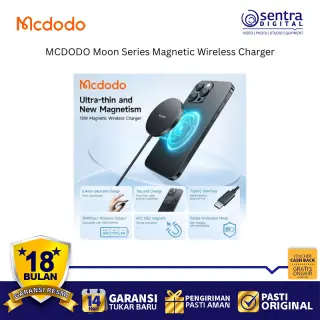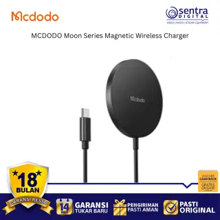 MCDODO Moon Series Magnetic Wireless Charger - CH-4360 adalah pengisi daya nirkabel magnetik ultra-tipis dan ringan yang dirancang untuk pengisian daya cepat hingga 15W, terutama kompatibel dengan perangkat iPhone seri 12, 13, dan 14 dengan dukungan MagSafe.