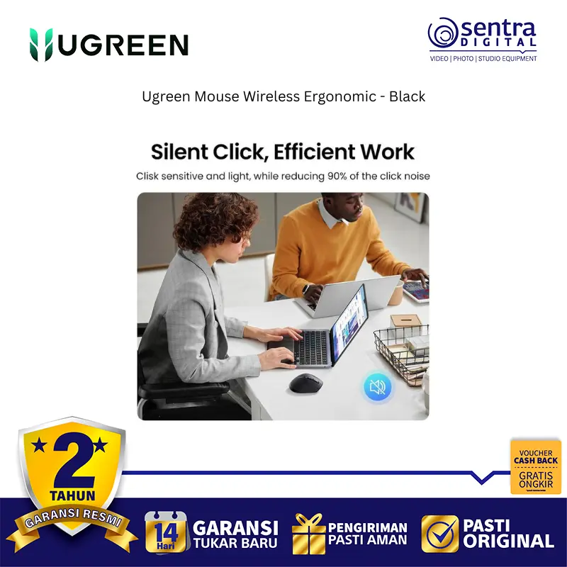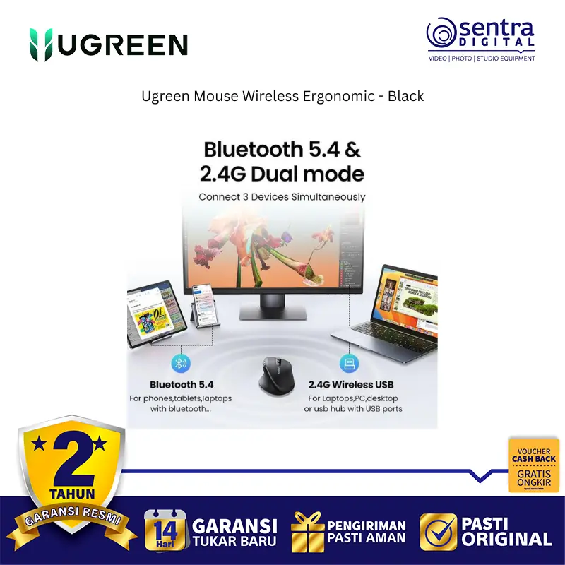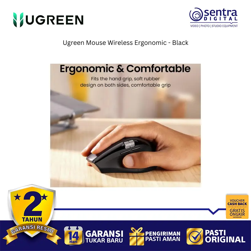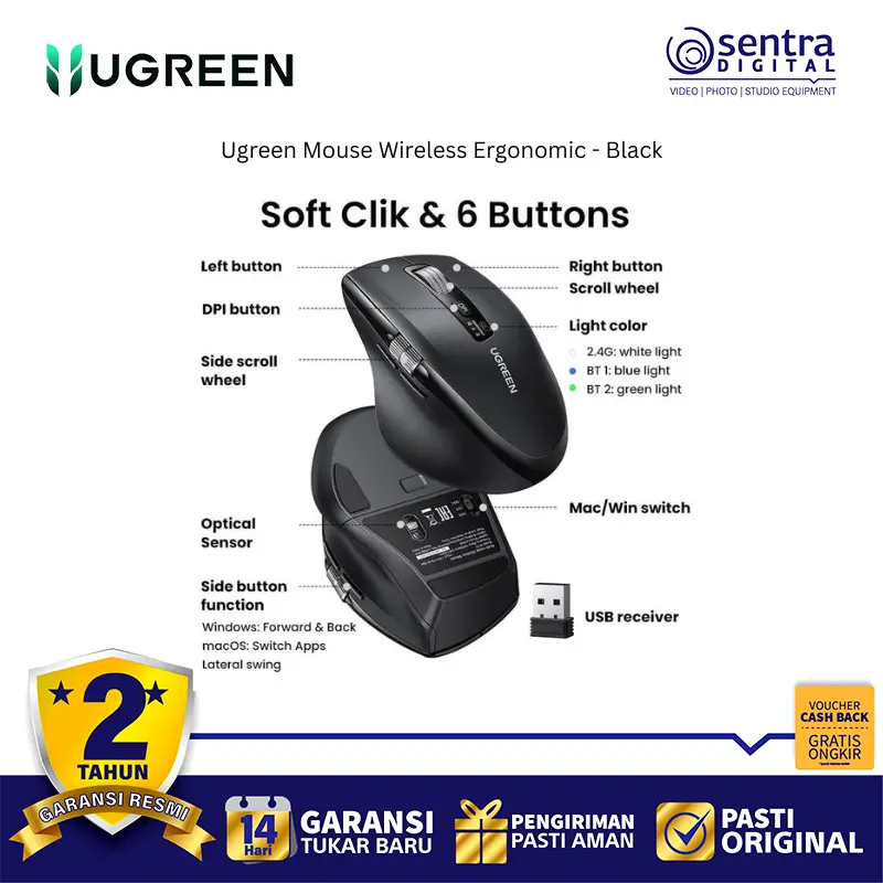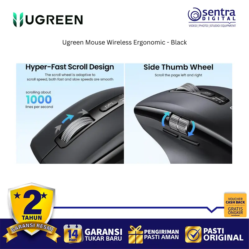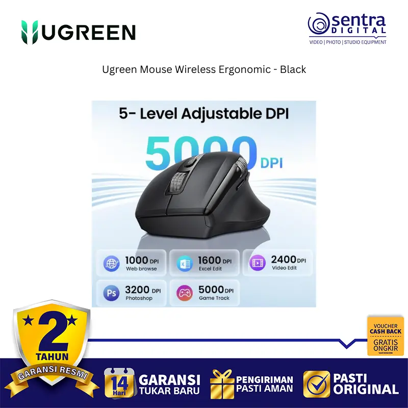 Ugreen Mouse Wireless Ergonomic 2.4Ghz + Bluetooth High Speed 5000 DPI Black - 45792 adalah tetikus nirkabel dual mode yang menawarkan koneksi melalui receiver 2.4Ghz dan Bluetooth 5.4, memungkinkannya terhubung hingga 3 perangkat sekaligus. Tetikus ini dirancang secara ergonomis dengan lekukan yang nyaman untuk mengurangi ketegangan pergelangan tangan, serta dilengkapi dengan tombol silent click yang hening. Sensitivitasnya dapat diatur hingga 5 tingkat DPI yang dapat disesuaikan, mencapai maksimal 5000 DPI, dan memiliki fitur Hyper-Fast Scroll Wheel untuk scrolling yang cepat. Selain itu, tetikus ini dikenal dengan daya tahan baterai yang lama dan fitur tidur otomatis untuk penghematan energi.