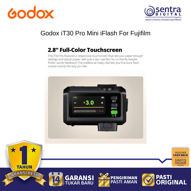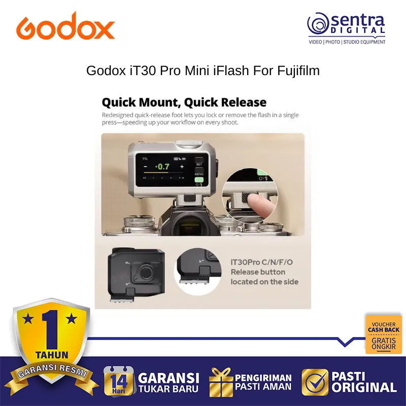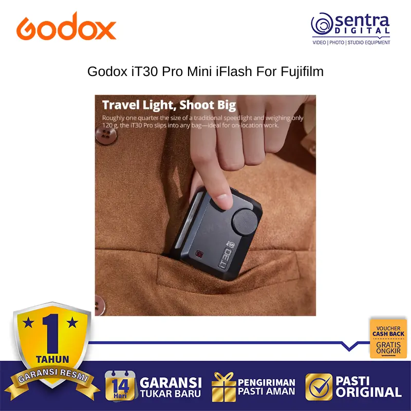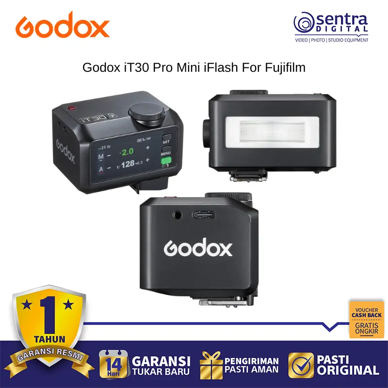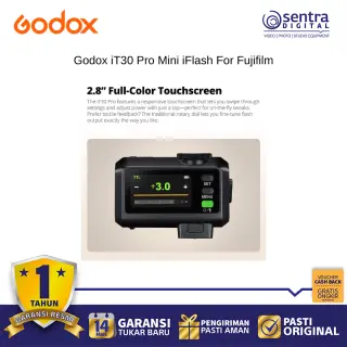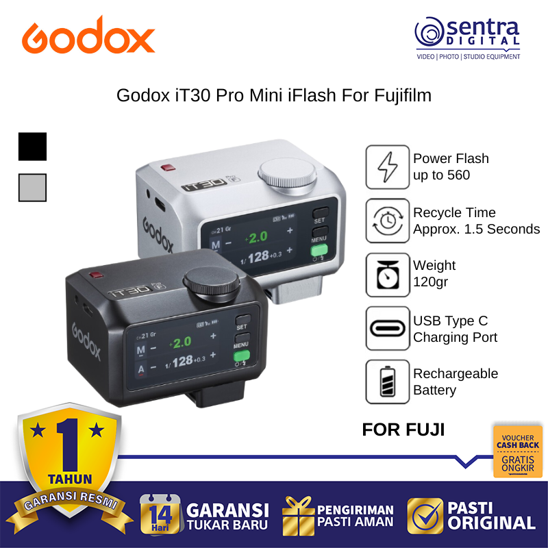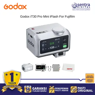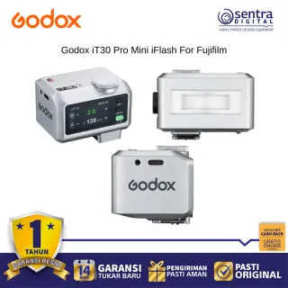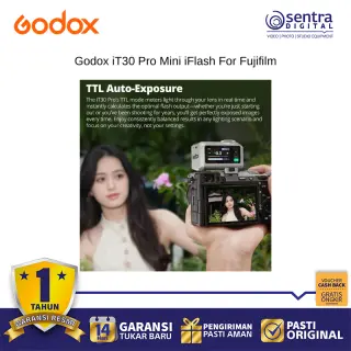 Godox iT30 Pro Mini iFlash untuk Fuji adalah lampu kilat (flash) TTL ringkas dan ultra-portabel yang dirancang khusus untuk kamera Fujifilm. Dengan dimensi yang sangat kecil dan bobot hanya sekitar 120 gram, flash ini ideal untuk dibawa bepergian dan dipasang di atas kamera. Meskipun ukurannya mini, ia menawarkan eksposur otomatis TTL, dukungan sinkronisasi kecepatan tinggi (HSS) hingga 1/8000 detik, dan memiliki Pemandu Angka (Guide Number) yang cukup kuat yaitu GN15 (ISO 100, meter).