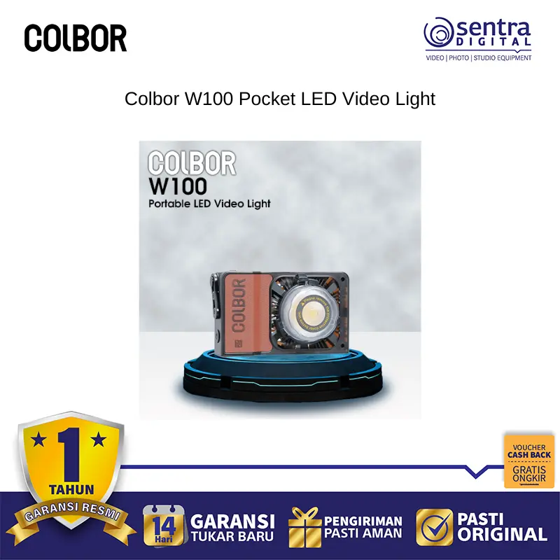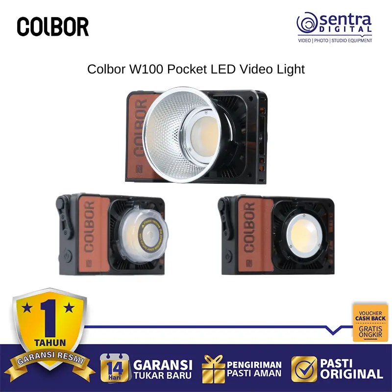 Colbor W100 Pocket LED Video Light adalah lampu video LED portabel bertenaga 100W dengan desain ringkas seperti kamera, sangat ringan, dan mudah dibawa. Lampu ini memiliki desain panel datar yang inovatif dan menggunakan manik lampu besar serta teknologi difusi canggih untuk menghasilkan pencahayaan yang luas, merata, dan seragam dengan output yang tinggi (hingga 6.790 Lux pada 1m, 5600K dengan reflektor). W100 tersedia dalam pilihan dua warna (bi-color) dengan suhu warna 2700K hingga 6500K dan menawarkan akurasi warna yang tinggi (CRI 97+, TLCI 99). Pengaturan dapat dilakukan melalui kontrol di unit atau melalui aplikasi seluler COLBOR Studio. Untuk daya, lampu ini sangat fleksibel, dapat menggunakan adaptor AC, power grip opsional, atau pengisian cepat PD Type-C. Terdapat juga sistem pendingin aktif yang senyap, menjadikannya pilihan ideal untuk pembuat konten, vlogger, dan fotografer yang membutuhkan pencahayaan kuat dan berkualitas di mana saja. Terdapat juga varian W100R yang menawarkan kemampuan RGB.