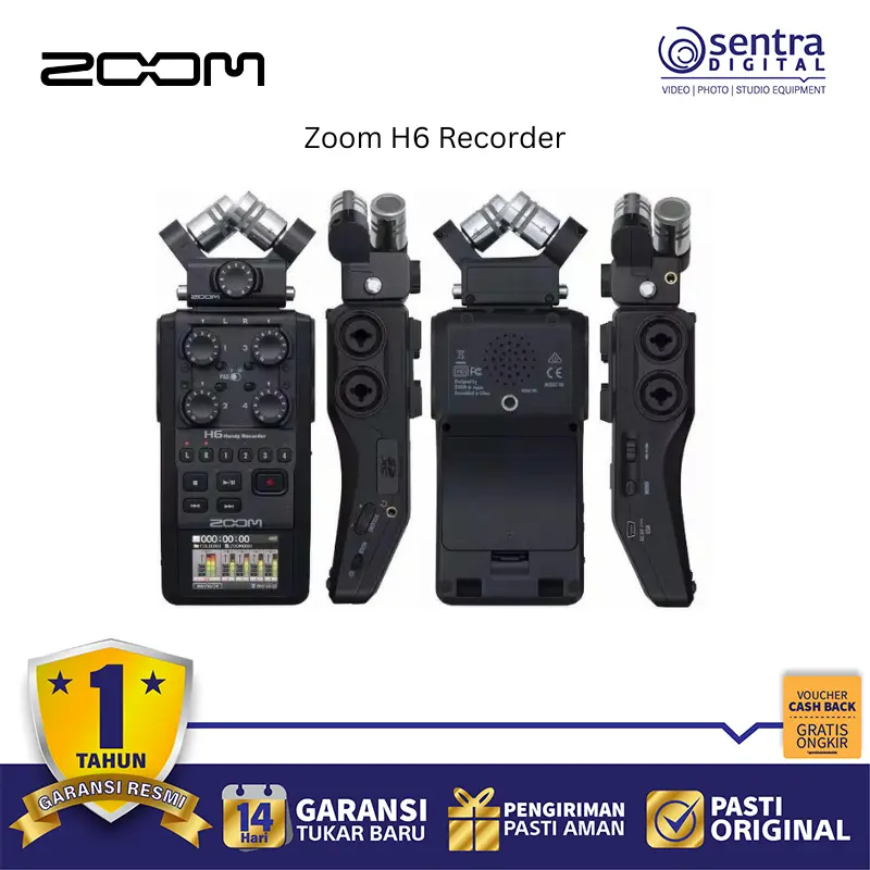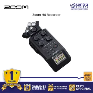 Zoom H6 Handy Recorder adalah perekam audio portabel serbaguna yang dirancang untuk memenuhi kebutuhan profesional mulai dari podcasting, pengambilan suara di lokasi, hingga rekaman musik dan wawancara. Fitur utamanya yang paling menonjol adalah sistem kapsul mikrofon yang dapat ditukar, yang memungkinkan pengguna memilih antara berbagai konfigurasi mikrofon seperti X/Y dan Mid-Side sesuai dengan kebutuhan rekaman spesifik mereka. Perangkat ini mampu melakukan perekaman multitrack secara simultan hingga enam trek berkat empat input kombo XLR/TRS yang fleksibel dengan preamp berkualitas tinggi, ditambah dua input dari kapsul yang terpasang, serta mendukung kualitas audio hingga 24-bit/96kHz. Setiap input dilengkapi dengan kenop gain individu yang besar, pad switch, dan dukungan phantom power, memungkinkan penyesuaian level input yang cepat dan intuitif. Selain fungsi utamanya sebagai perekam, H6 juga dapat berfungsi sebagai antarmuka audio USB enam input/dua output untuk komputer atau iPad, serta memiliki fungsi perekaman cerdas seperti Pre-record dan Backup-record untuk memastikan momen audio penting tidak terlewatkan. Seluruh fungsionalitas ini terintegrasi dalam bodi yang kokoh, mudah dioperasikan, dan dilengkapi layar LCD berwarna besar untuk visibilitas yang jelas.