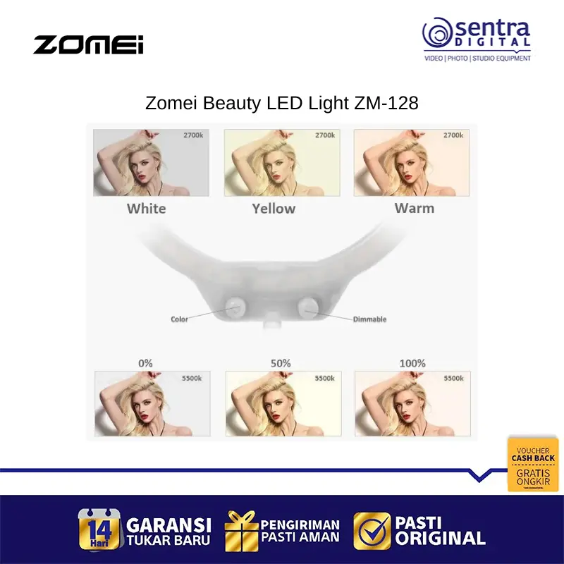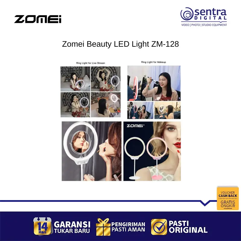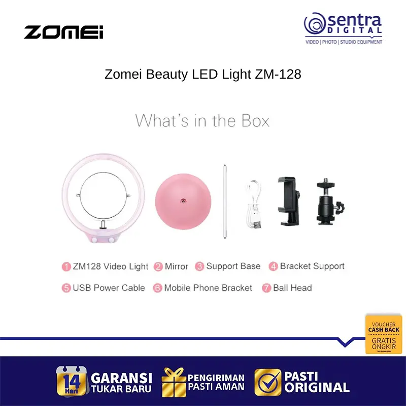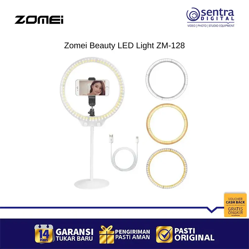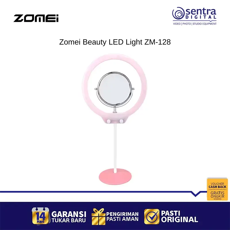 Zomei Beauty LED Light ZM-128 warna Pink merupakan sebuah lampu cincin LED portable berukuran sekitar 10 hingga 10,5 inci yang dirancang khusus untuk keperluan selfie, makeup, live streaming, dan fotografi macro atau potret. Lampu ini memiliki 128 unit LED yang mampu menghasilkan cahaya lembut, seragam, dan bebas bayangan, serta memberikan efek lingkaran unik pada mata. Keunggulan utamanya terletak pada fitur penyesuaian dimmer yang memungkinkan pengguna mengatur tingkat kecerahan dan temperatur warna secara terus menerus (stepless dimming) dari cahaya hangat (3200K) hingga cahaya dingin (5500K), memastikan Anda selalu mendapatkan pencahayaan optimal. Dengan nilai Color Rendering Index (CRI) tinggi, lampu ini mampu mereproduksi warna objek secara akurat dan alami. Lampu ZM-128 ini sangat fleksibel dalam hal sumber daya, karena menggunakan port USB dan dapat dihidupkan melalui power bank, adaptor USB, atau port USB komputer, menjadikannya praktis untuk dibawa bepergian dan digunakan di berbagai lokasi.