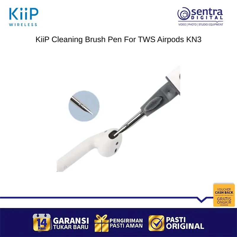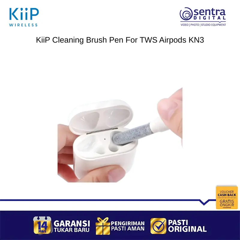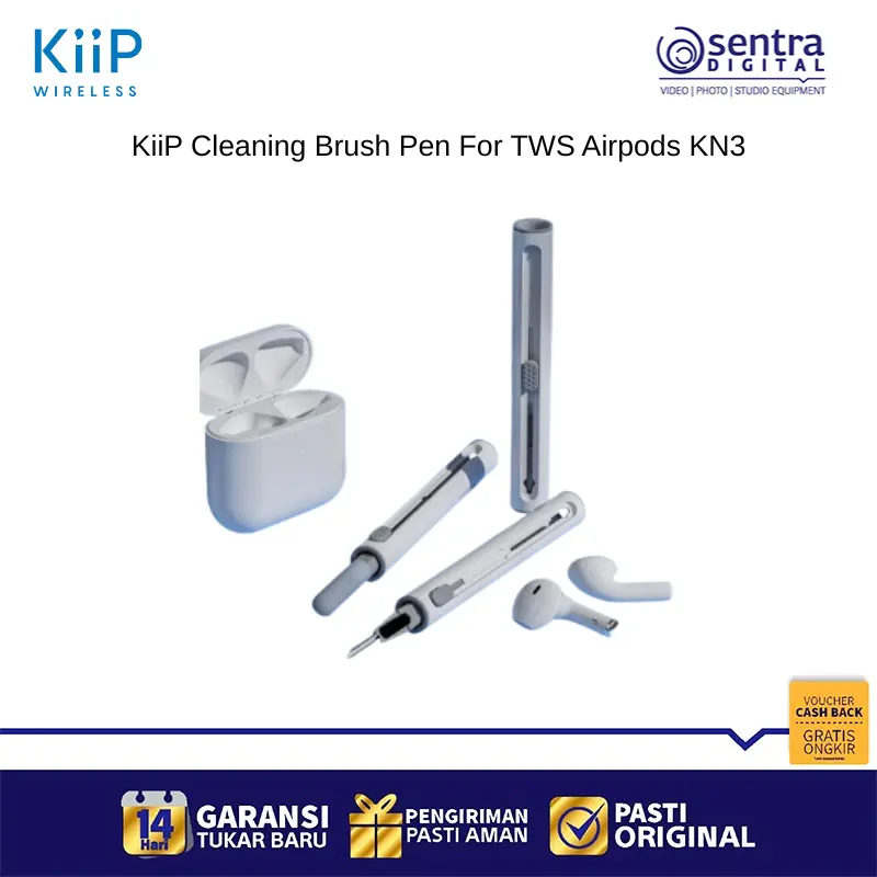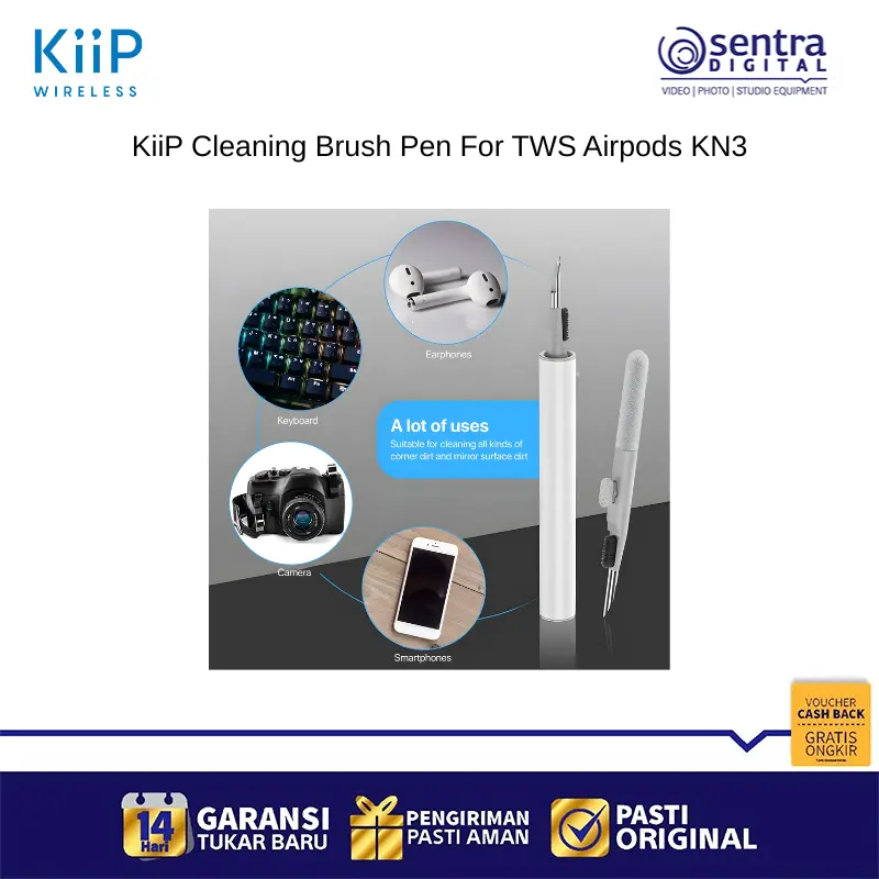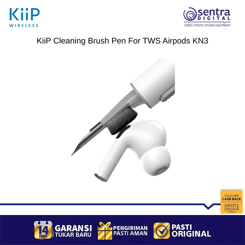 KiiP Cleaning Brush Pen For TWS Airpods KN3 adalah alat pembersih multifungsi 3-in-1 yang dirancang khusus dalam bentuk kompak seperti pulpen, membuatnya mudah dibawa dan disimpan. Alat ini memiliki tiga komponen utama untuk membersihkan berbagai kotoran pada earbuds TWS, Airpods, dan wadah pengisi dayanya: ujung logam yang presisi untuk mengikis kotoran membandel pada celah kecil, sikat berdensitas tinggi yang dapat ditarik dan lembut untuk menyapu debu dan kotoran tanpa menggores, serta spons lembut yang khusus untuk membersihkan bagian dalam wadah pengisi daya. Semua materialnya dirancang aman dan efektif untuk membersihkan peralatan sensitif.