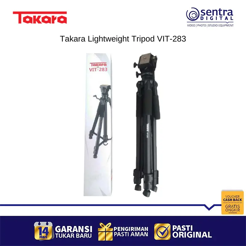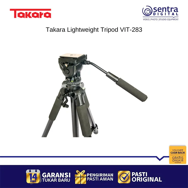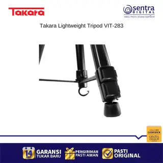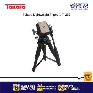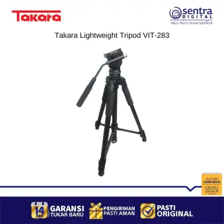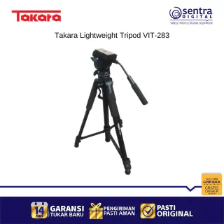 Takara Lightweight Tripod VIT-283 adalah tripod video fluid head yang dirancang untuk pengguna kamera DSLR, mirrorless, atau camcorder yang mencari solusi yang kuat namun tetap ringan dan mudah dibawa. Dibuat dari perpaduan material aluminium dan plastik ABS, tripod ini memiliki desain yang kokoh namun tetap menempatkannya dalam kategori lightweight. Ia dilengkapi dengan pan head 3-arah yang menyediakan gerakan panning dan tilting yang halus untuk videografi, serta memiliki fitur spirit level atau waterpass pada kepalanya untuk memastikan kamera seimbang dan gambar tidak miring. Tripod ini mampu mencapai tinggi maksimal sekitar 1710 mm dengan kapasitas beban maksimal yang umum disebutkan adalah 3 kg (beberapa sumber menyebutkan 5 kg). Strukturnya diperkuat dengan kaki yang memiliki desain flip-lock yang kuat untuk pengaturan tinggi yang cepat, dan juga menyertakan quick release plate agar pemasangan dan pelepasan kamera dapat dilakukan dengan mudah.