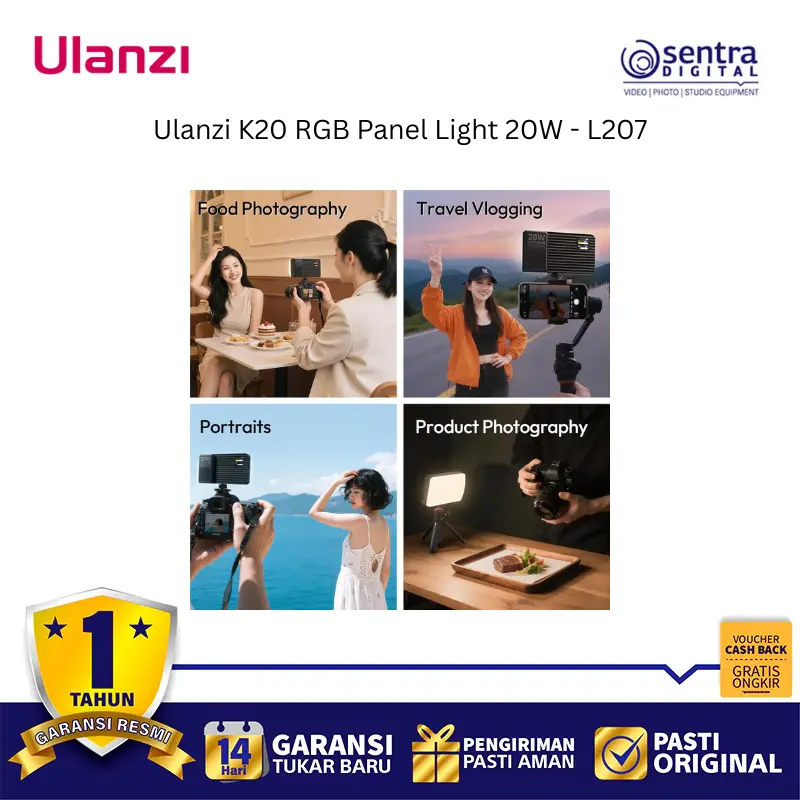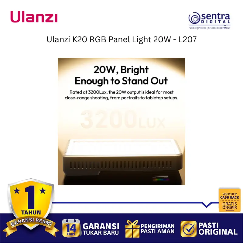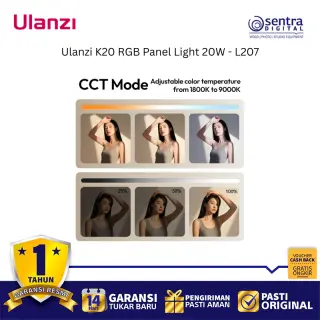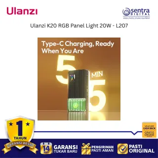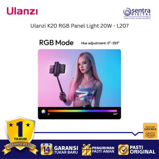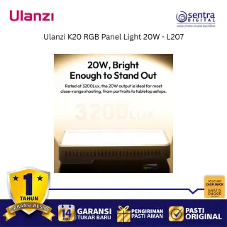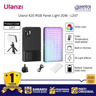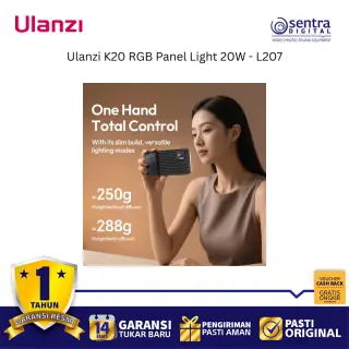 Ulanzi K20 RGB Panel Light 20W (L207) adalah lampu panel LED full-color yang sangat portabel dan ringkas dengan output daya maksimum 20W, menjadikannya pilihan ideal dan terjangkau untuk kebutuhan content creation seperti vlogging, live streaming, dan fotografi produk. Lampu ini mampu menghasilkan kecerahan hingga 3200 lux pada jarak 0,5 meter dan menawarkan kontrol pencahayaan yang fleksibel melalui tiga mode: CCT untuk suhu warna yang dapat disesuaikan secara luas antara 1800K hingga 9000K, RGB untuk spektrum warna penuh 0 hingga 359 derajat, dan mode Scene yang menyediakan 20 efek pencahayaan khusus. Dengan dimensi yang ramping dan berat hanya sekitar 250 gram, lampu ini mudah dioperasikan dengan satu tangan berkat desain pegangan samping yang ergonomis dan dilengkapi baterai internal 3300mAh yang mendukung pengisian daya melalui port USB Type-C, serta memiliki CRI tinggi (92-96) untuk akurasi warna yang baik.