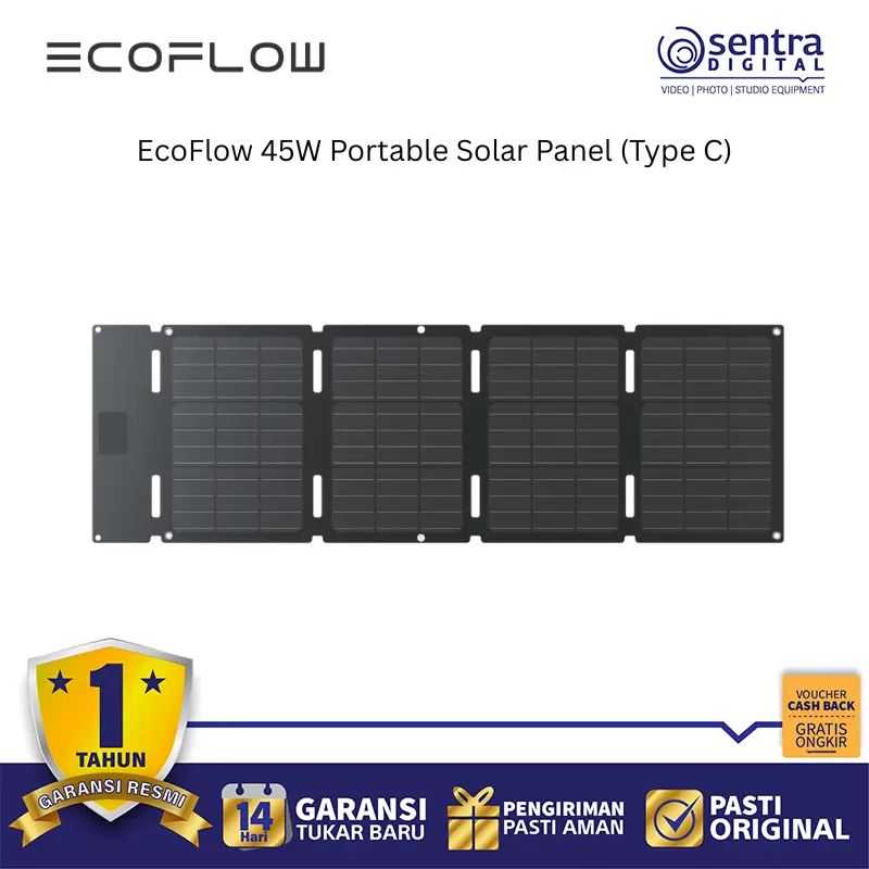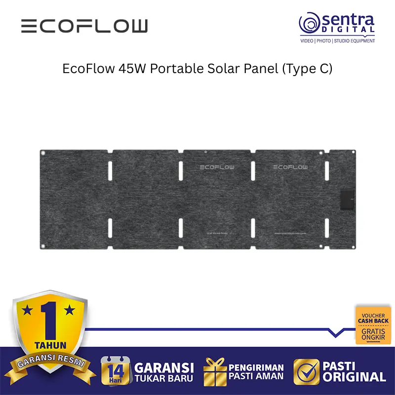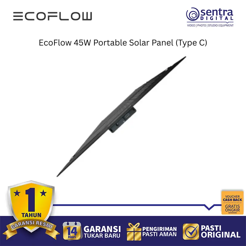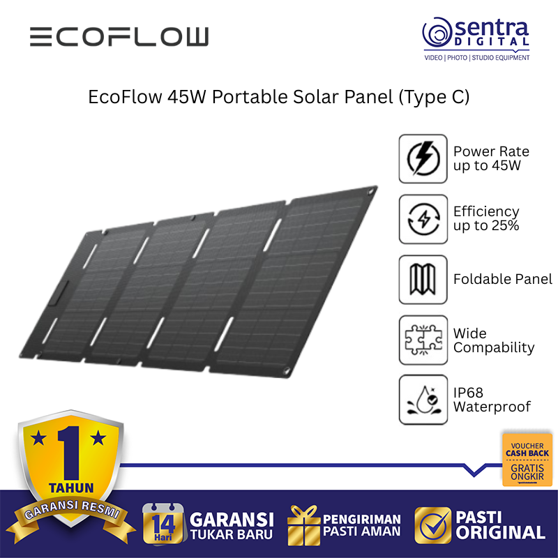 EcoFlow 45W Portable Solar Panel (Type C) adalah panel surya lipat yang sangat ringan dan ringkas, dirancang untuk memberi daya langsung pada perangkat elektronik Anda saat bepergian atau dalam situasi darurat. Dengan berat sekitar 1,4 kg dan desain yang dapat dilipat menyerupai ukuran laptop, panel ini mudah dibawa dalam ransel saat berkemah, mendaki, atau melakukan perjalanan. Keunggulan utamanya adalah adanya port output USB-C dengan daya maksimum tertentu yang memungkinkan Anda mengisi daya ponsel, tablet, power bank, atau bahkan laptop secara langsung tanpa memerlukan stasiun daya tambahan, selain juga dilengkapi konektor DC5521 untuk mengisi daya power station seri EcoFlow. Panel ini menggunakan sel surya N-Type TOPCon Monocrystalline berteknologi tinggi yang menawarkan efisiensi konversi hingga 25% dan memiliki peringkat ketahanan air dan debu IP68 yang kuat, menjadikannya tahan terhadap kondisi luar ruangan yang ekstrem seperti hujan, debu, dan panas matahari langsung.