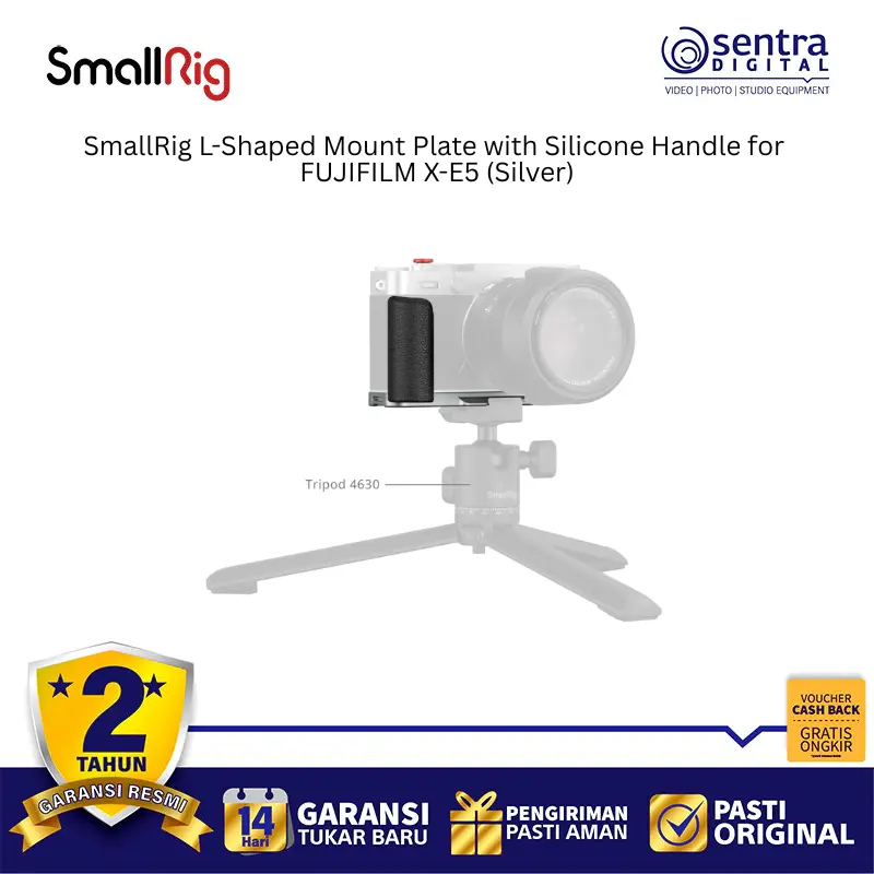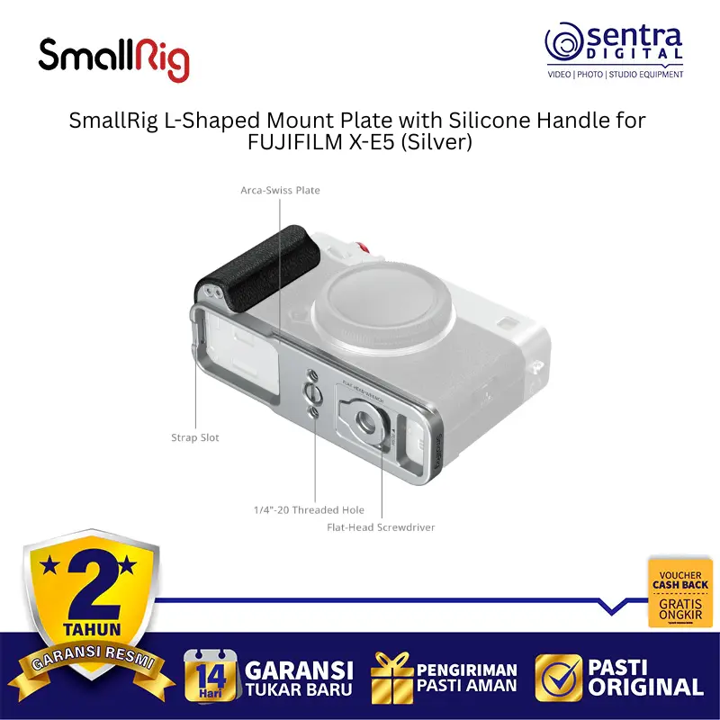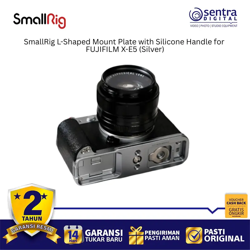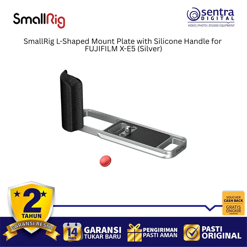 SmallRig L-Shaped Mount Plate with Silicone Handle for FUJIFILM X-E5 (Silver) 5447 adalah aksesori ergonomis yang dirancang khusus untuk meningkatkan kenyamanan genggaman sekaligus memberikan fleksibilitas pemasangan pada kamera FUJIFILM X-E5. Pelat ini memiliki desain berwarna perak yang serasi dengan estetika bodi kamera dan dilengkapi dengan pegangan silikon lembut untuk kontrol yang lebih mantap saat memotret. Pada bagian bawah dan sampingnya terdapat dudukan tipe Arca-Swiss yang memungkinkan transisi cepat antara orientasi pemotretan horizontal dan vertikal saat menggunakan tripod. Meskipun terpasang kuat, desainnya tetap memastikan akses penuh ke pintu baterai, layar LCD, dan port konektivitas tanpa hambatan. Selain itu, pelat ini dilengkapi dengan lubang sekrup 1/4-20 untuk pemasangan aksesori tambahan serta kunci pas magnetik terintegrasi di bagian bawah untuk memudahkan bongkar pasang kapan saja.