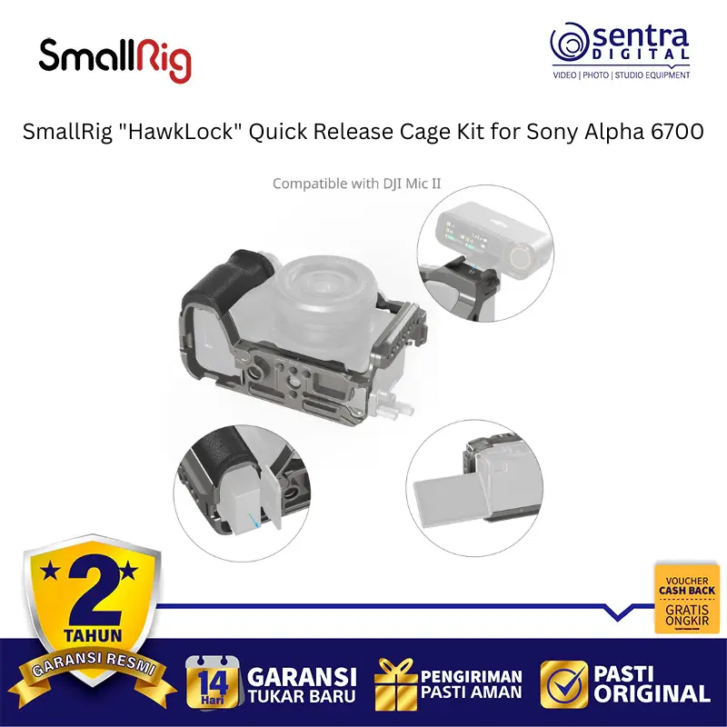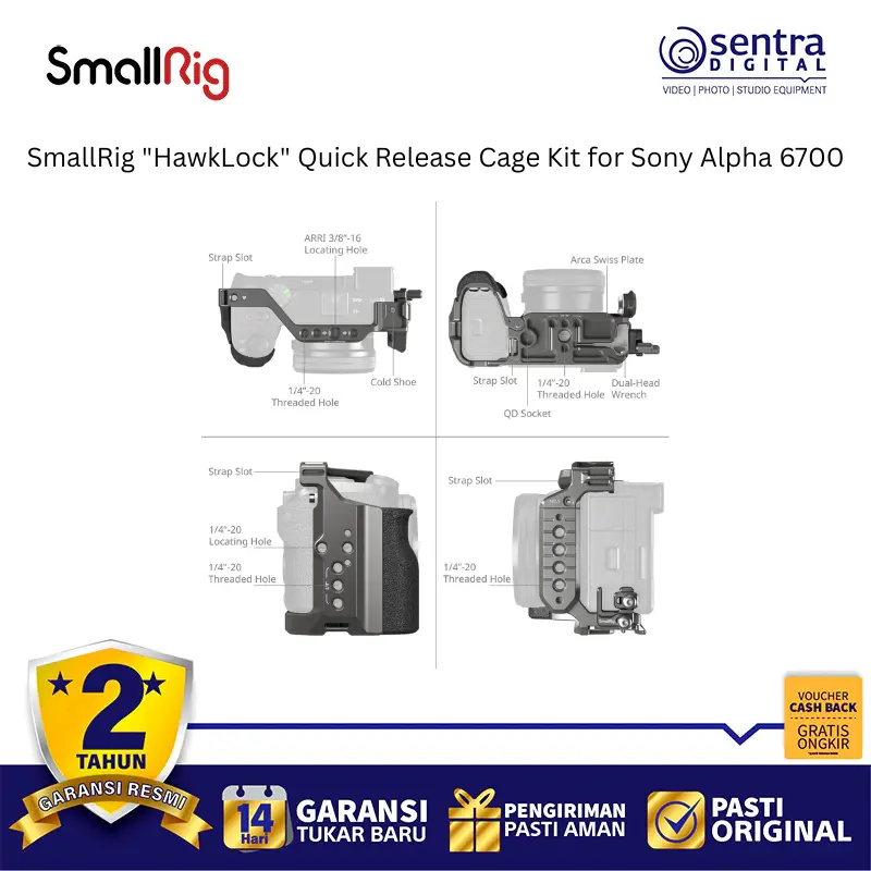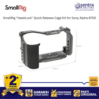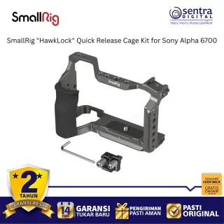 SmallRig HawkLock Quick Release Cage Kit for Sony Alpha 6700 5060 adalah solusi perlindungan kamera yang mengintegrasikan sistem quick release HawkLock yang telah dipatenkan untuk pemasangan aksesori satu klik yang mulus dan aman. Kit ini terdiri dari cage aluminium yang pas di badan kamera serta penjepit kabel HDMI untuk memastikan transmisi data tetap stabil tanpa gangguan koneksi. Cage ini menggunakan sistem penguncian tiga titik yang mencakup sekrup bawah dan sekrup M2.5 di kedua sisi, serta dilengkapi bantalan silikon untuk mencegah goresan pada bodi kamera. Untuk kenyamanan penggunaan, tersedia pegangan silikon ergonomis dan pintu engsel pada bagian kompartemen baterai yang memudahkan akses serta memberikan dukungan tambahan bagi jari kelingking. Antarmuka pemasangannya sangat lengkap, mulai dari lubang berulir 1/4-20 inci, lubang lokasi ARRI 3/8-16 inci, cold shoe, rel NATO, hingga soket QD untuk tali bahu. Selain itu, pelat Arca-Swiss yang terintegrasi di bagian bawah memungkinkan transisi cepat antara pemotretan genggam, penggunaan tripod, atau pemasangan pada gimbal seri DJI RS.