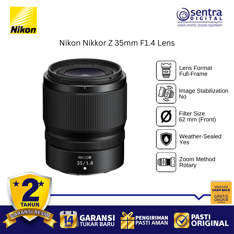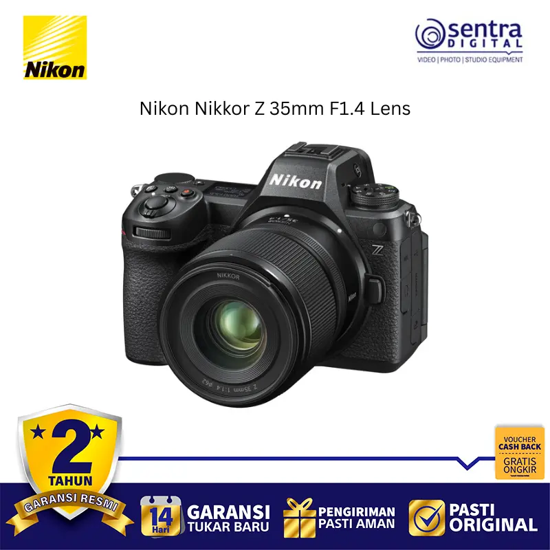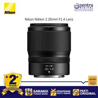 Nikon Nikkor Z 35mm f/1.4 adalah lensa prime sudut lebar yang dirancang untuk kamera mirrorless full-frame seri Z, menawarkan kombinasi antara aperture maksimal yang sangat cerah dan bodi yang tetap ringkas. Lensa ini menjadi pilihan menarik bagi fotografer jalanan, dokumenter, dan lanskap karena mampu menghasilkan bokeh yang lembut serta performa luar biasa dalam kondisi cahaya rendah. Dengan berat hanya sekitar 415 gram, lensa ini sangat portabel untuk penggunaan sehari-hari namun tetap tangguh berkat desain yang tahan debu dan percikan air. Dari sisi teknis, ia dilengkapi dengan motor stepping STM untuk autofokus yang cepat dan senyap serta cincin kontrol yang dapat dikustomisasi untuk pengaturan aperture atau ISO tanpa suara, menjadikannya andal baik untuk kebutuhan fotografi maupun videografi profesional.