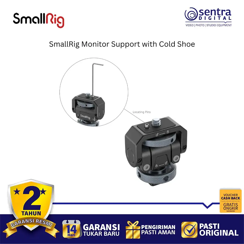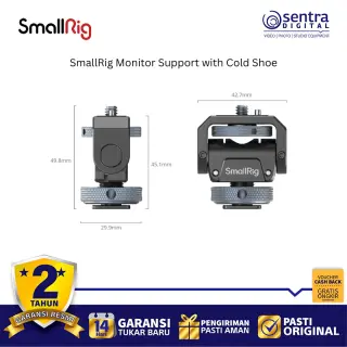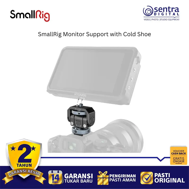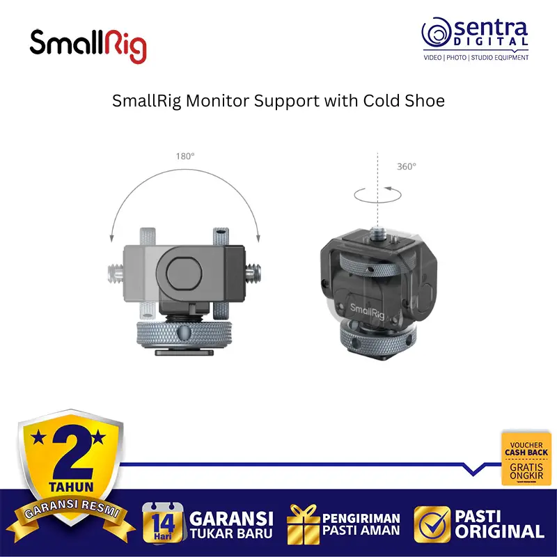 SmallRig Monitor Support with Cold Shoe 3809B adalah dudukan monitor kamera yang dirancang untuk memberikan fleksibilitas maksimal dalam memantau pengambilan gambar. Alat ini terpasang dengan mudah ke cold shoe kamera atau sangkar kamera dan mampu menahan beban monitor hingga 1,5 kg. Dengan kemampuan rotasi 360 derajat secara horizontal dan kemiringan hingga 180 derajat, pengguna dapat mengatur sudut pandang dengan bebas sesuai kebutuhan lapangan. Dudukan ini dilengkapi dengan baut jempol yang ergonomis untuk penguncian yang kuat tanpa memerlukan alat tambahan, serta bantalan karet di bagian atas untuk melindungi monitor dari goresan dan mencegah pergeseran. Terbuat dari paduan aluminium yang kokoh namun ringan, aksesori ini menjadi solusi praktis bagi videografer untuk menjaga stabilitas monitor eksternal selama produksi.