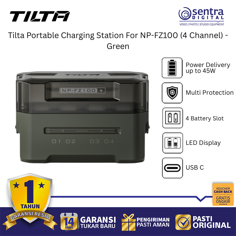 untuk mengisi daya perangkat lain seperti ponsel atau monitor. Desainnya yang berwarna hijau khas Tilta dilengkapi dengan lampu indikator status pengisian daya yang jelas dan perlindungan sirkuit terpadu untuk mencegah panas berlebih atau pengisian daya berlebih. Dengan bentuk yang ringkas dan portabel, stasiun pengisi daya ini sangat ideal dibawa ke lokasi syuting untuk memastikan ketersediaan energi baterai yang berkelanjutan dalam jangka waktu lama.