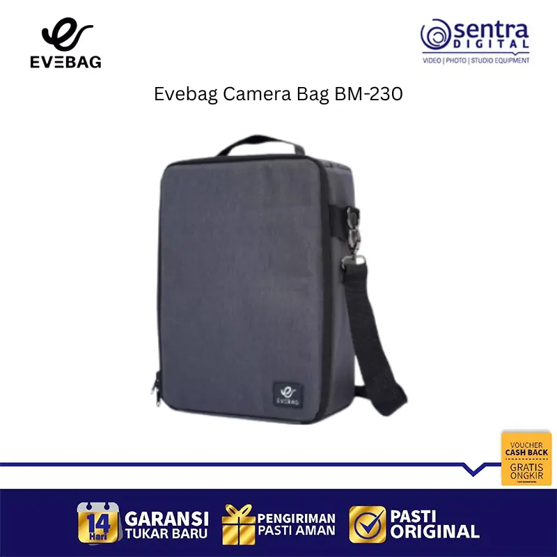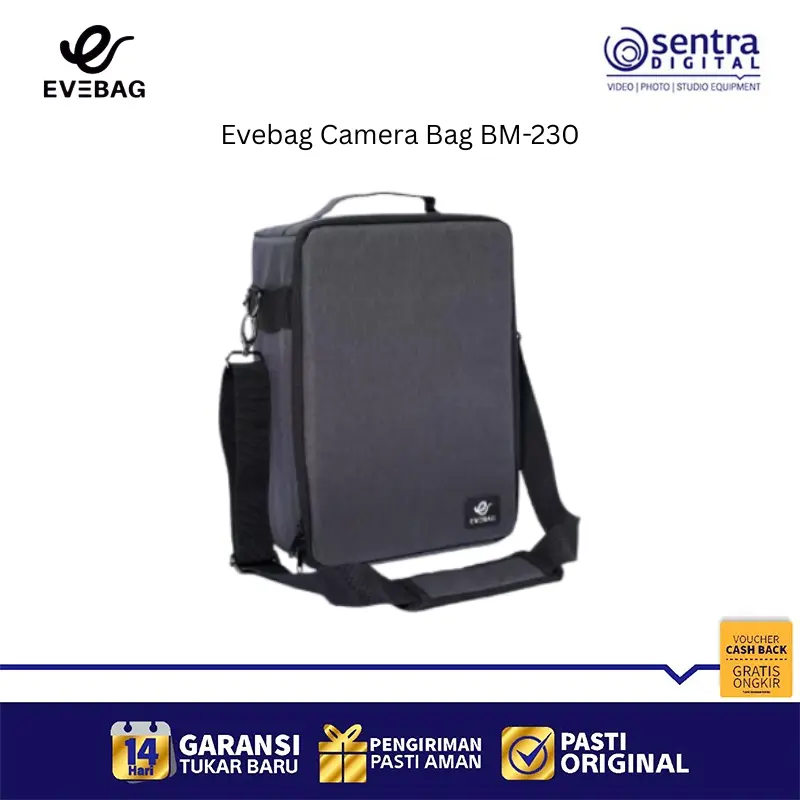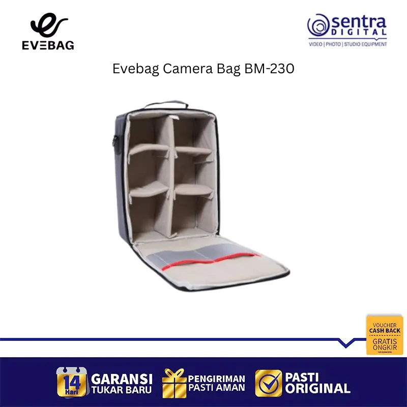 Evebag BM-230 adalah sebuah camera bag insert fleksibel yang dirancang untuk melindungi peralatan fotografi saat diletakkan di dalam tas biasa atau koper. Dengan dimensi sekitar 24 x 12 x 32 cm, insert ini memiliki kapasitas yang cukup untuk menampung satu kamera DSLR atau Mirrorless beserta lensa, lampu kilat, pengisi daya, dan aksesori pendukung lainnya. Tas ini terbuat dari material poliester premium dengan lapisan dalam kain nylex yang halus serta bantalan busa setebal 10mm untuk meredam guncangan secara maksimal. Desainnya yang praktis memungkinkan fotografer mengubah tas apa pun menjadi tas kamera yang aman, terorganisir, dan tetap ringan saat dibawa bepergian.