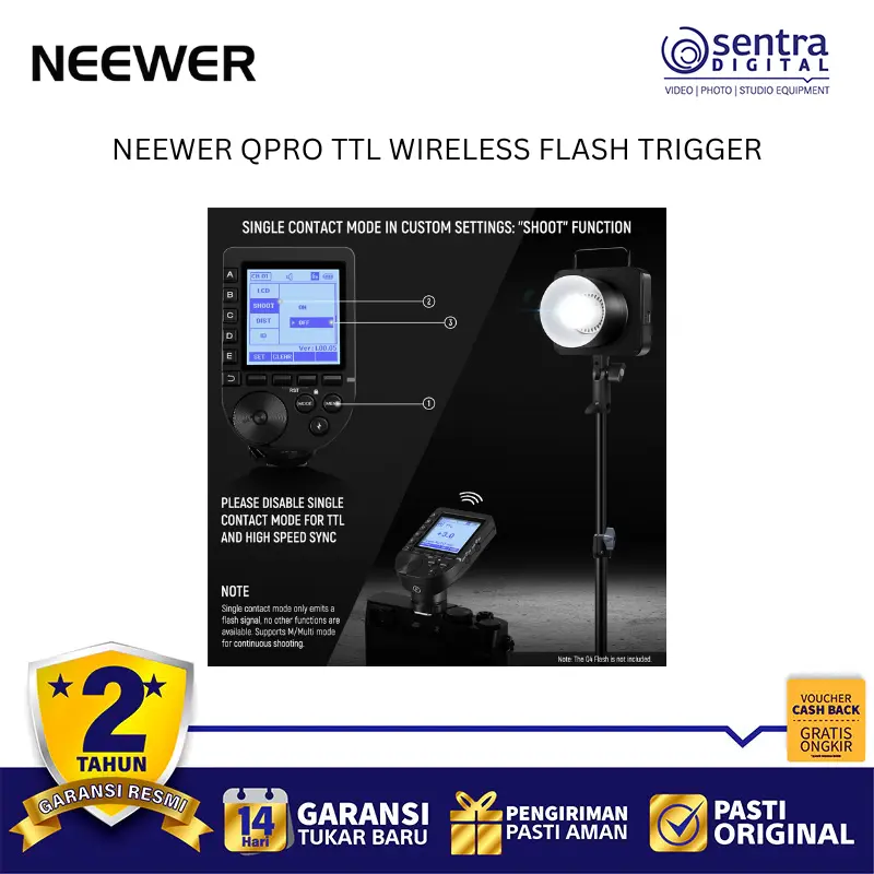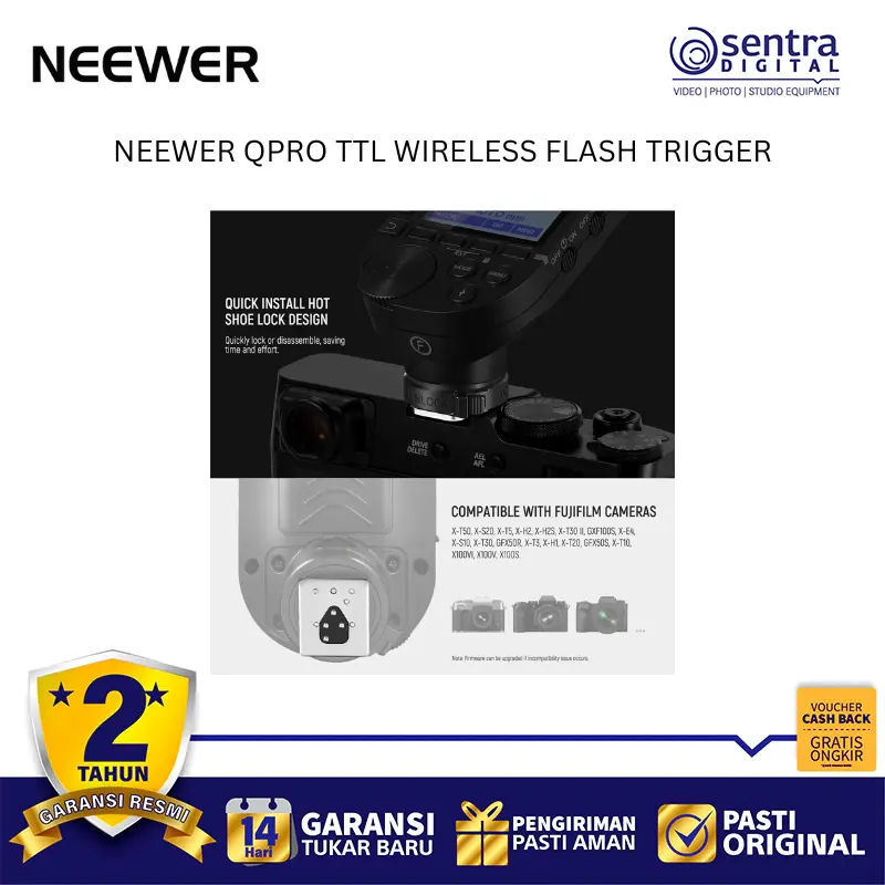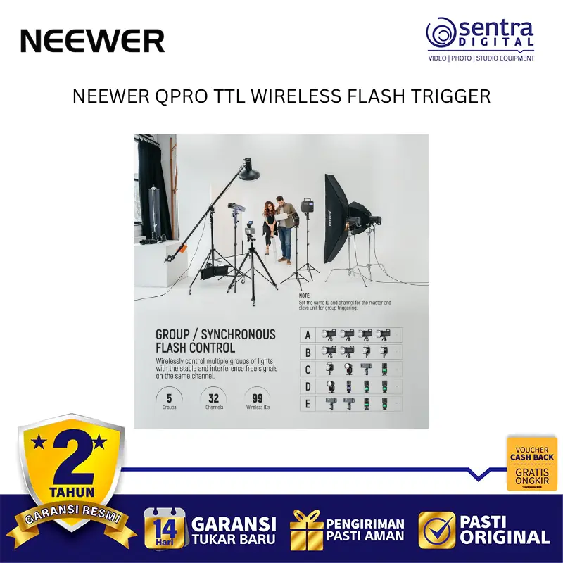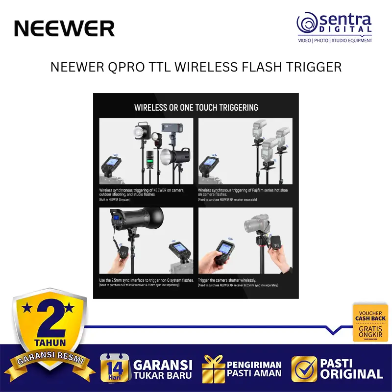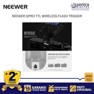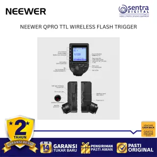 Neewer QPRO TTL Wireless Trigger adalah pemicu lampu kilat nirkabel profesional yang menggunakan sistem frekuensi 2.4 GHz untuk pengendalian cahaya yang stabil hingga jarak 100 meter. Perangkat ini mendukung berbagai mode canggih mulai dari TTL Autoflash, Manual, hingga Multi Flash, serta dilengkapi fitur sinkronisasi kecepatan tinggi atau High-Speed Sync hingga 1/8000 detik. Dengan layar LCD besar yang memiliki lampu latar dan antarmuka yang miring, pengguna dapat dengan mudah memantau serta mengatur hingga 5 grup dan 32 saluran secara bersamaan. Unit ini juga memiliki fitur tambahan seperti bantuan fokus, kontrol lampu pemodelan, serta port USB-C untuk pembaruan perangkat lunak, menjadikannya pusat kendali yang sangat fleksibel bagi fotografer yang menggunakan sistem kamera Canon, Nikon, Sony, maupun Fujifilm.