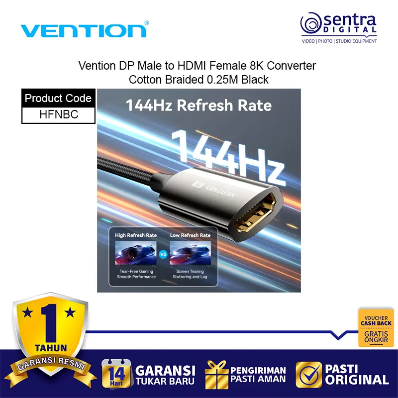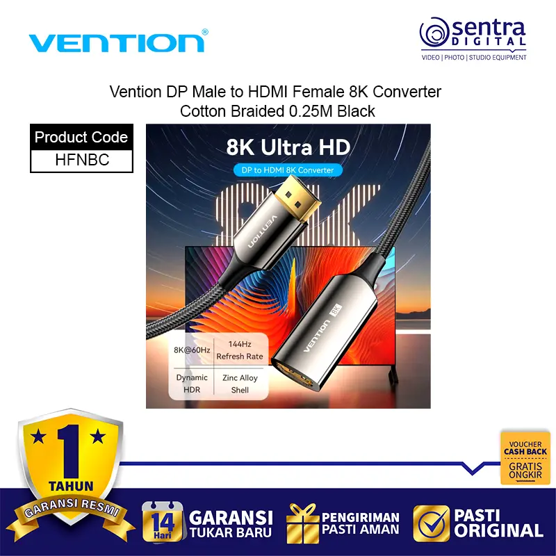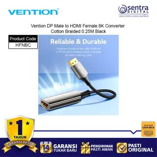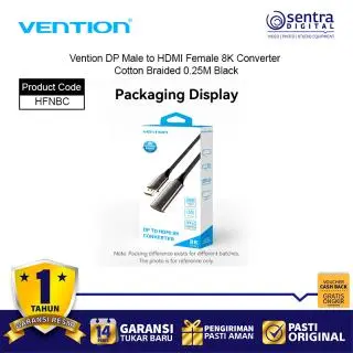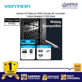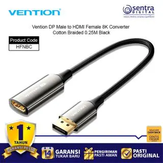 Vention Cotton Braided DP Male to HDMI Female 8K Converter 0.25M adalah adaptor premium yang memungkinkan koneksi perangkat DisplayPort ke HDMI dengan kualitas maksimal. Dengan dukungan resolusi hingga 8K Ultra HD, converter ini memberikan gambar super tajam dan detail. Kabel pendek 0.25 meter dengan desain cotton braided membuatnya fleksibel, tahan lama, dan anti kusut. Housing berbahan zinc alloy hitam menambah kekuatan sekaligus tampilan elegan. Cocok untuk menghubungkan PC, laptop, atau kartu grafis dengan monitor, TV, maupun proyektor HDMI.