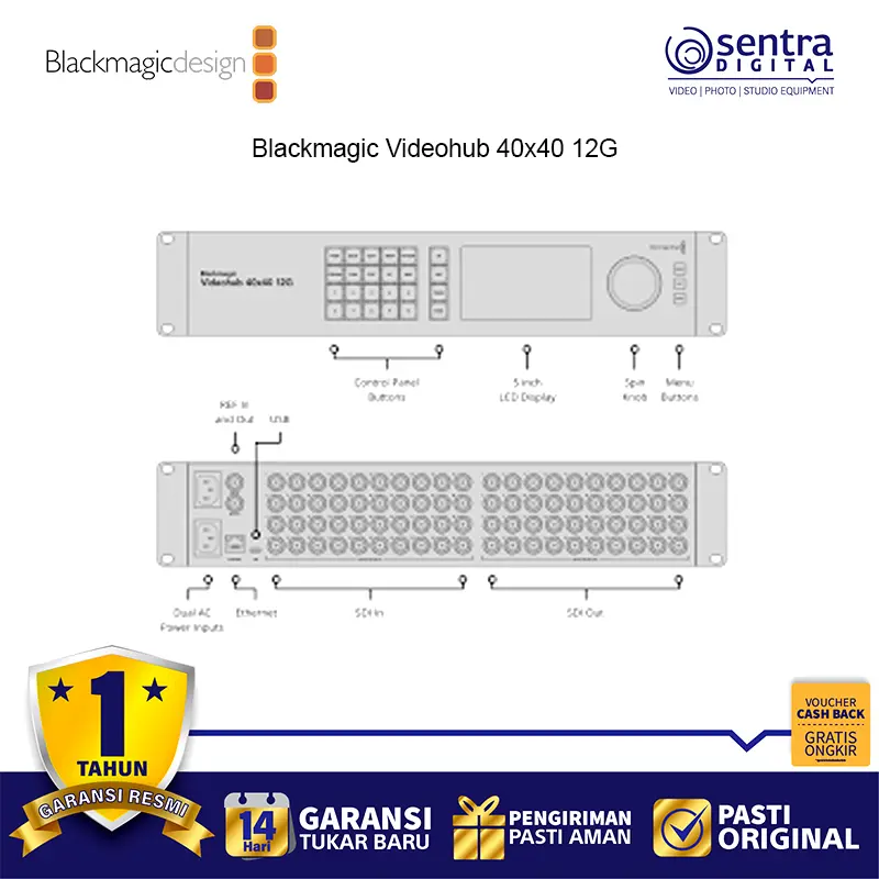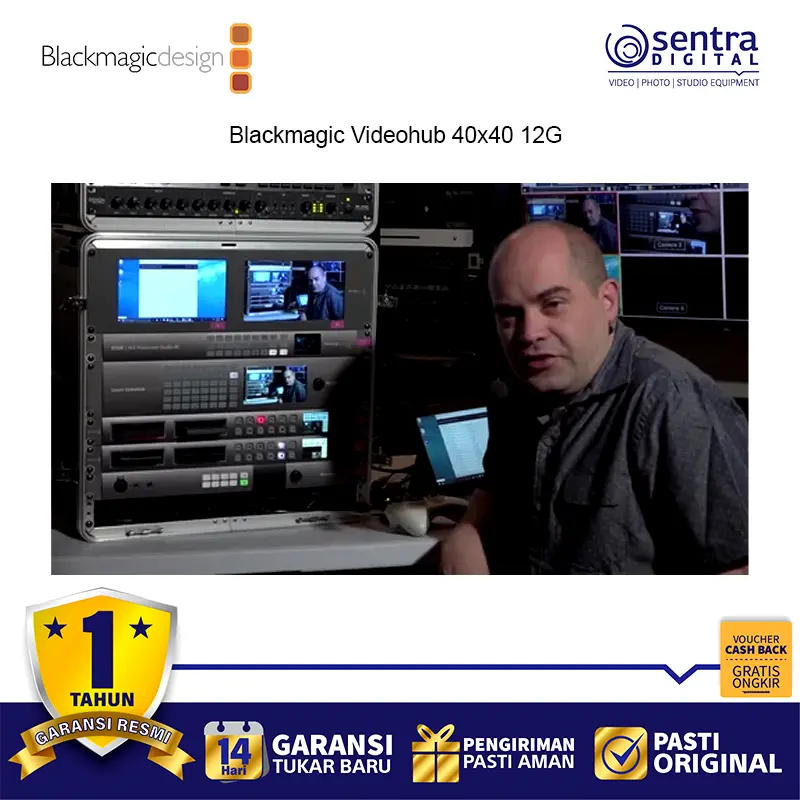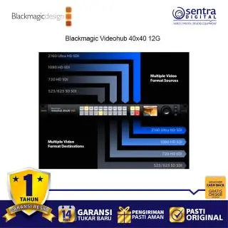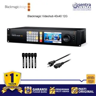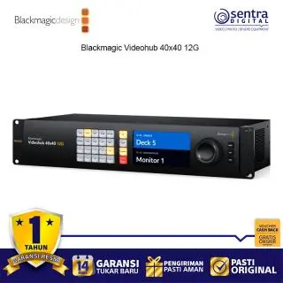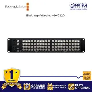 Blackmagic Videohub 40x40 12G – Router video profesional dengan 40 input dan 40 output 12G-SDI, mendukung resolusi hingga 4K, dilengkapi panel kontrol terintegrasi, ideal untuk studio televisi, live event, dan produksi broadcasting dengan fleksibilitas routing maksimal.