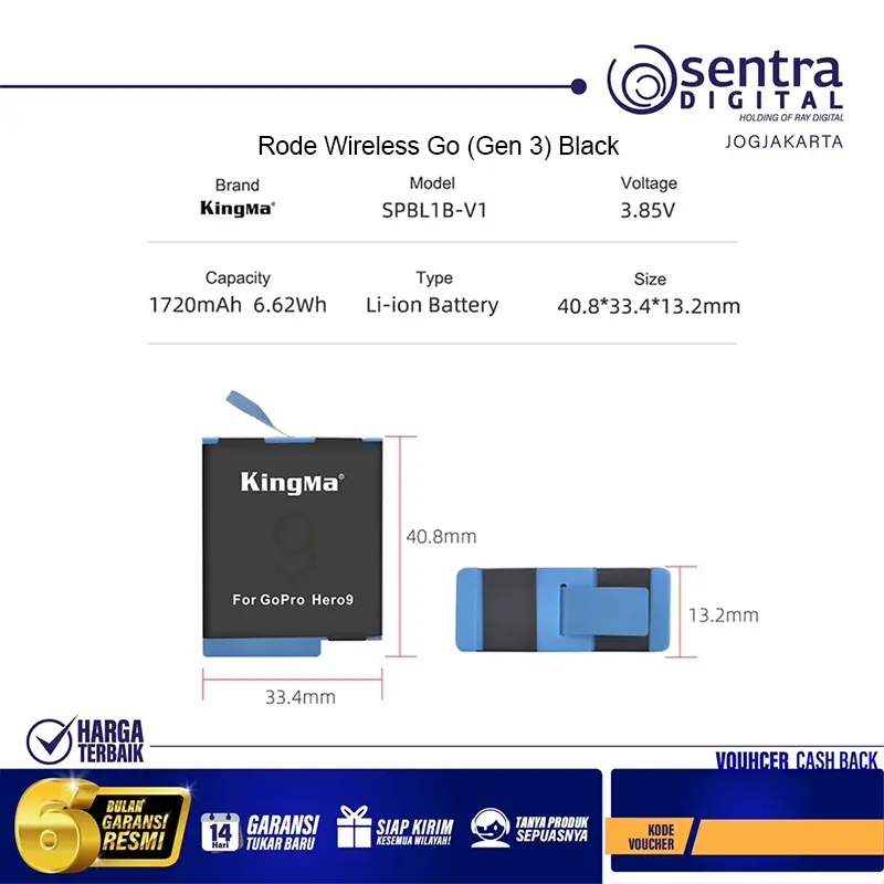 Kingma Battery SPBL1B adalah baterai isi ulang berkapasitas besar 1720mAh yang dirancang untuk GoPro Hero 9 dan Hero 10. Memberikan waktu pemotretan lebih lama dan performa stabil, sangat cocok untuk merekam petualangan, olahraga, maupun vlog tanpa khawatir kehabisan daya. Ringkas dan ringan, mudah dibawa sebagai cadangan saat perjalanan jauh.