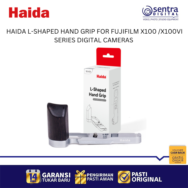 Haida L-Shaped Hand Grip HD4811 adalah aksesori ergonomis yang dirancang khusus untuk meningkatkan kenyamanan genggaman dan stabilitas pada kamera Fujifilm seri X100 termasuk model X100VI terbaru. Terbuat dari paduan aluminium yang kokoh namun ringan, pegangan ini memberikan ruang ekstra bagi jari-jari agar tidak cepat lelah saat penggunaan jangka panjang tanpa menambah beban berlebih pada kamera. Bagian bawahnya memiliki desain pelat dovetail standar Arca-Swiss yang memungkinkan transisi cepat ke tripod, serta tetap memberikan akses penuh ke pintu baterai dan slot kartu memori tanpa perlu melepas perangkat. Selain perlindungan tambahan pada bodi kamera, hand grip ini juga dilengkapi dengan lubang baut standar dan lubang tali pengikat, menjadikannya solusi praktis untuk meningkatkan aspek fungsionalitas sekaligus estetika klasik pada kamera Fujifilm Anda.