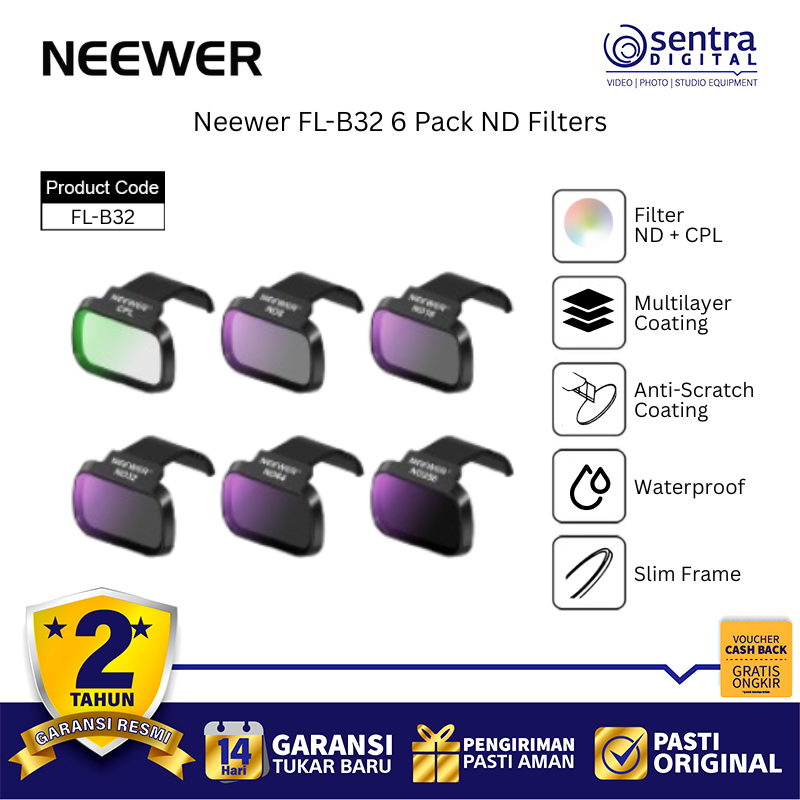 Neewer FL-B32 adalah paket filter ND yang terdiri dari enam varian densitas berbeda untuk mengontrol masuknya cahaya secara presisi pada lensa drone DJI Mini 4 Pro, 3 Pro, 2 SE, dan seri Mavic Mini. Terbuat dari kaca optik berkualitas tinggi dengan lapisan multi-layer, filter ini efektif mengurangi silau dan meningkatkan saturasi warna tanpa mengubah keseimbangan warna alami gambar. Desain bingkai aluminium yang sangat ringan memastikan penggunaan filter tidak memengaruhi kalibrasi gimbal atau performa terbang drone secara keseluruhan. Dengan pilihan mulai dari ND4 hingga ND1000, kit ini memungkinkan pilot drone untuk menangkap video dengan motion blur yang sinematik serta foto eksposur panjang yang jernih bahkan dalam kondisi cahaya matahari yang sangat terik.