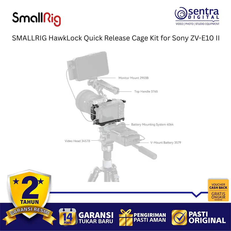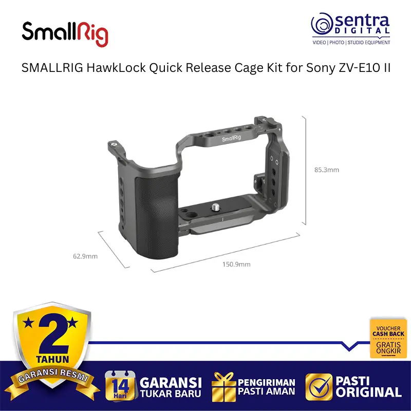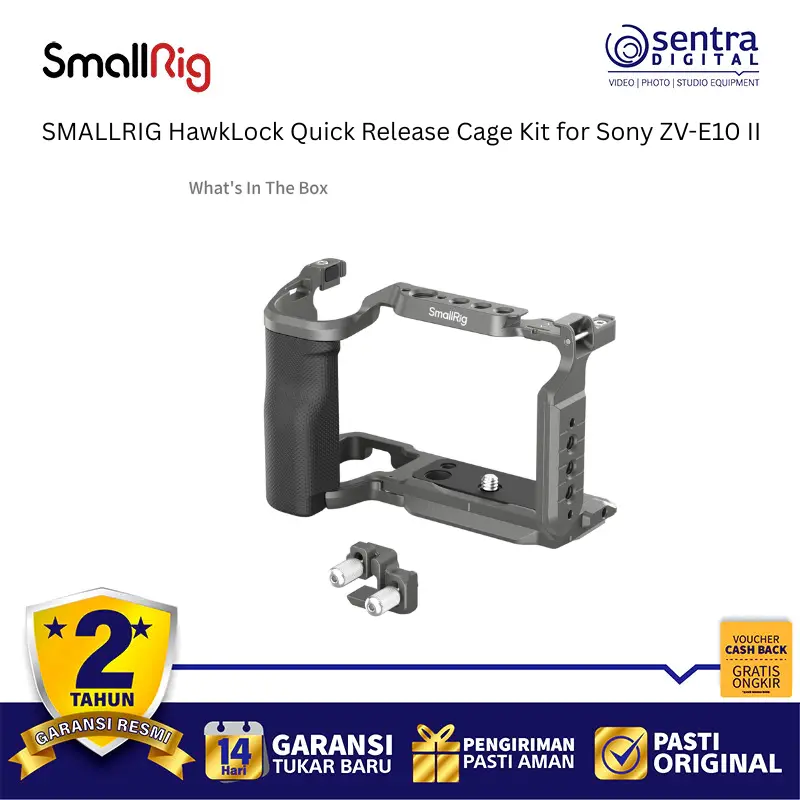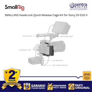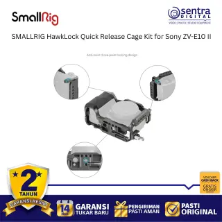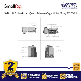 SmallRig HawkLock Quick Release Cage Kit for Sony ZV-E10 II 4949 adalah solusi perlindungan dan ekspansi mutakhir yang dirancang khusus untuk meningkatkan ergonomi serta fleksibilitas kamera vlog Sony terbaru. Kit ini mengintegrasikan teknologi HawkLock yang memungkinkan pemasangan aksesori seperti pegangan atas atau monitor secara instan dan aman hanya dengan satu klik, sehingga mempercepat alur kerja di lapangan secara signifikan. Rangka bodi atau cage ini dibuat dengan presisi untuk memberikan akses penuh ke semua tombol, slot kartu, serta layar artikulasi kamera tanpa hambatan sekaligus menyediakan banyak titik pemasangan seperti lubang baut 1/4 inci, 3/8 inci, dan dudukan cold shoe. Dilengkapi dengan pelat dasar Arca-Swiss yang terintegrasi, pengguna dapat dengan cepat berpindah antara pemotretan genggam, penggunaan tripod, maupun pemasangan pada gimbal seri DJI RS. Desainnya yang ramping namun kokoh tidak hanya melindungi bodi kamera dari benturan tetapi juga memberikan pegangan yang lebih mantap untuk pengambilan gambar yang lebih stabil dan profesional.