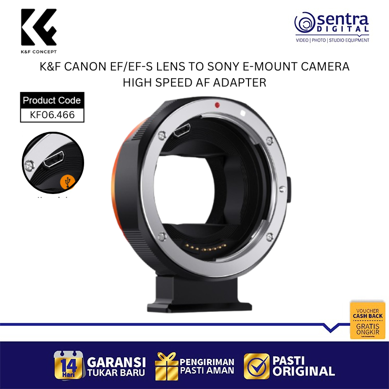 K&F Concept KF06.466 adalah adaptor lensa berperforma tinggi yang memungkinkan penggunaan lensa Canon EF atau EF-S pada bodi kamera Sony E-mount dengan dukungan fitur fokus otomatis yang sangat cepat dan akurat. Adaptor ini dilengkapi dengan kontak elektronik berlapis emas untuk memastikan transmisi data EXIF yang lancar serta mendukung kontrol aperture langsung dari bodi kamera dan fitur stabilisasi gambar IS pada lensa. Memiliki desain internal yang dilapisi material anti-pantulan untuk mencegah